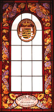 Abb. rechts: Bemalte Glastür von Louis Huth, früher Eingangstür von Louis Huths Laden in der Bahnhofstraße Pößneck (heute gehört es der Kunstglaserei Neuparth).