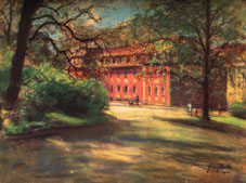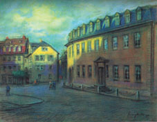 Franz Huth, der bekannteste Pößnecker Maler, wurde geboren am 9. November 1876 als 2. Sohn des Porzellanmalers Louis Huth in der Krautgasse 8. Er starb am 7. Juni 1970 in Weimar. (Abb. links: Franz Huth malt im Stehen in Weimar)
