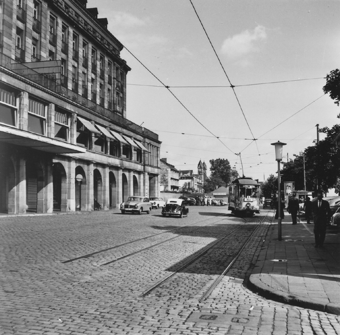 Linie 1 der Straßenbahn Koblenz an der Kreuzung Löhrstraße-Plan